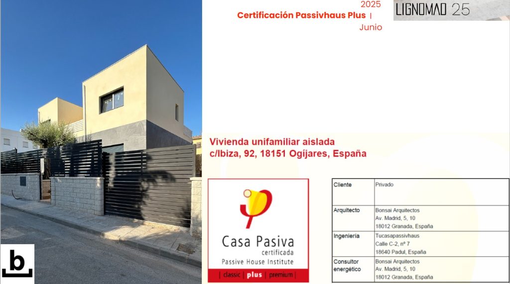 Imagen: Ficha de la vivienda en la plataforma Passivhaus, donde recibió la certificación Casa Pasiva Plus gracias a su diseño biopasivo y a la alta calidad de su envolvente estructural de madera. Fuente: Bonsai Arquitectos.