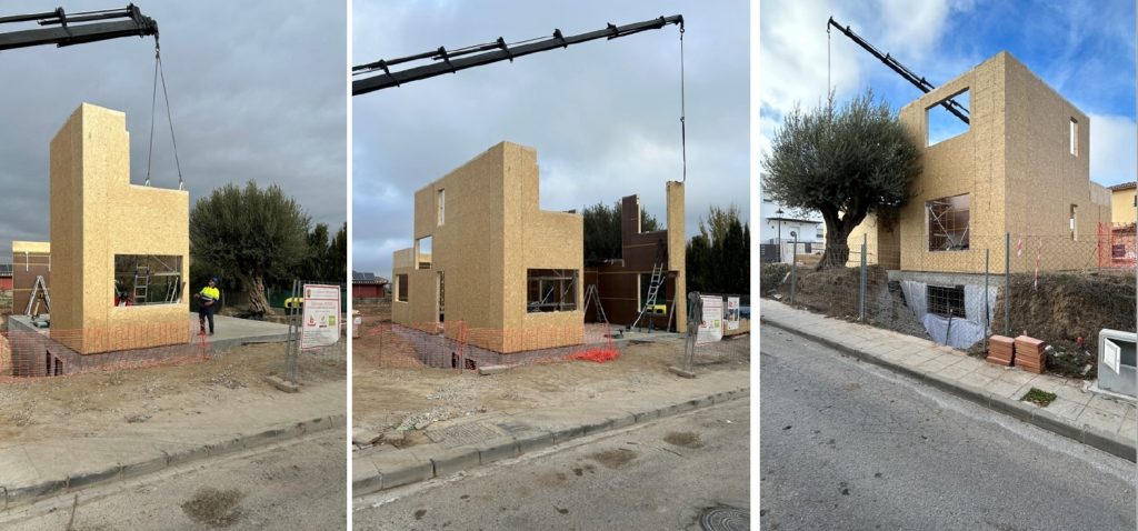 Imagen: Instantáneas del montaje de la vivienda en diciembre de 2023, que se desarrolló en 4 semanas atrayendo la atención de numerosos medios de comunicación. Fuente: Bonsai Arquitectos.