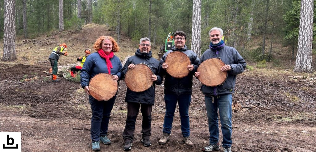 Imagen: Los propietarios de la vivienda Yolanda y Miguel Ángel, junto a Antolino Gallego del proyecto LIFE Wood For Future y Luis Llopis del equipo de Bonsai, durante la corta en Sierra de Cazorla de donde procede la madera de las vigas prototipadas, noviembre de 2022. Fuente: Bonsai Arquitectos.