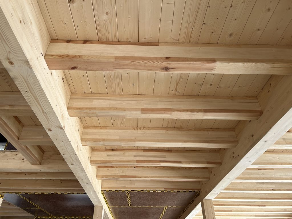 La materialización de estas vigas refleja un proceso que conecta distintos territorios y agentes: desde las choperas de la Vega de Granada y los pinares de Cazorla, pasando por el secado de la madera, los ensayos estructurales realizados en PEMADE, la fabricación industrial y su mecanización, hasta su montaje final en obra.